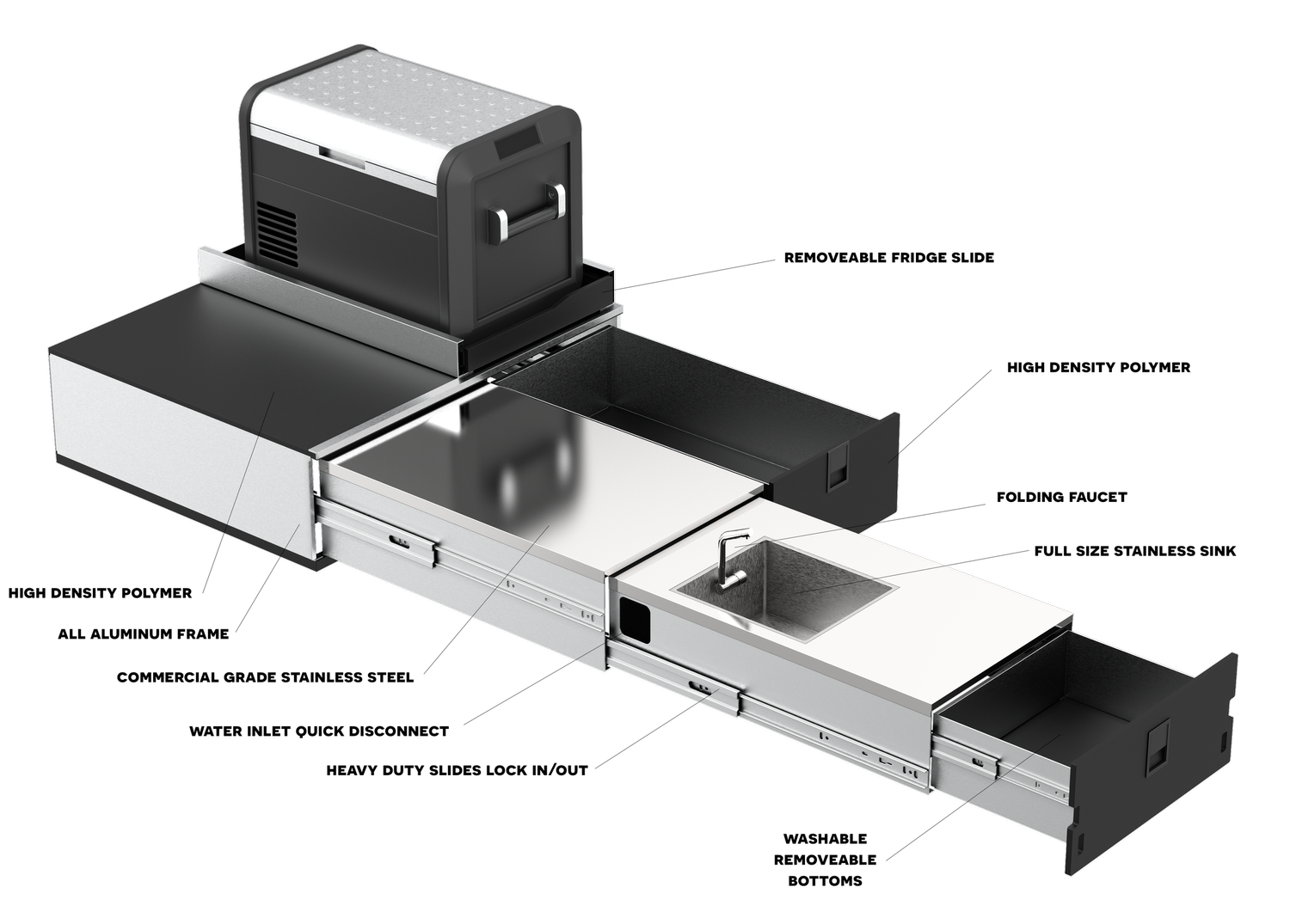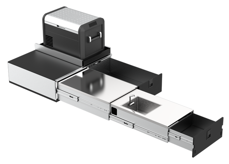 A: It’s fully modular and handcrafted in America using premium materials — designed to handle both weekend adventures and full-time vanlife cooking setups. -