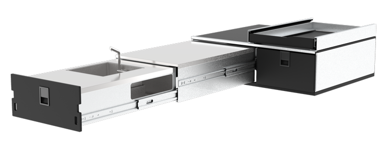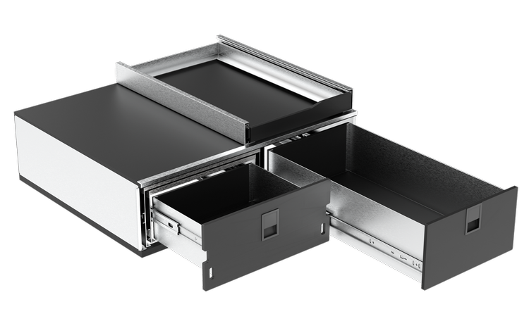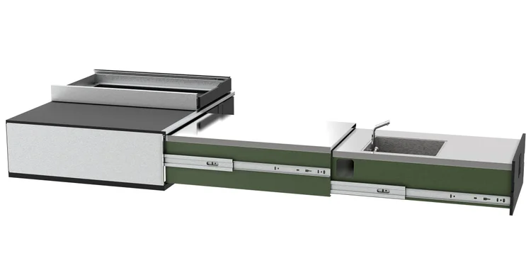 Features | Dual pull-out drawers, integrated stove platform, and fold-out prep wings |
