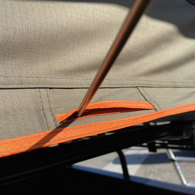 The Tuff Stuff Alpha II rooftop tent is crafted from durable 280g poly‑cotton fabric with a waterproof finish, built to handle tough conditions and keep you protected outdoors.