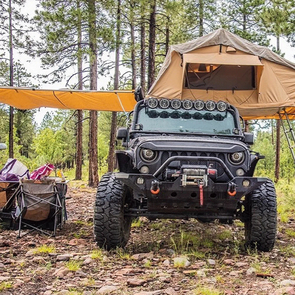 Shetler in All Weather Conditions - The Tuff Stuff Awning is made with 280G ripstop poly-cotton, UV resistant, waterproof fabric to ensure you have shelter in all weather conditions.